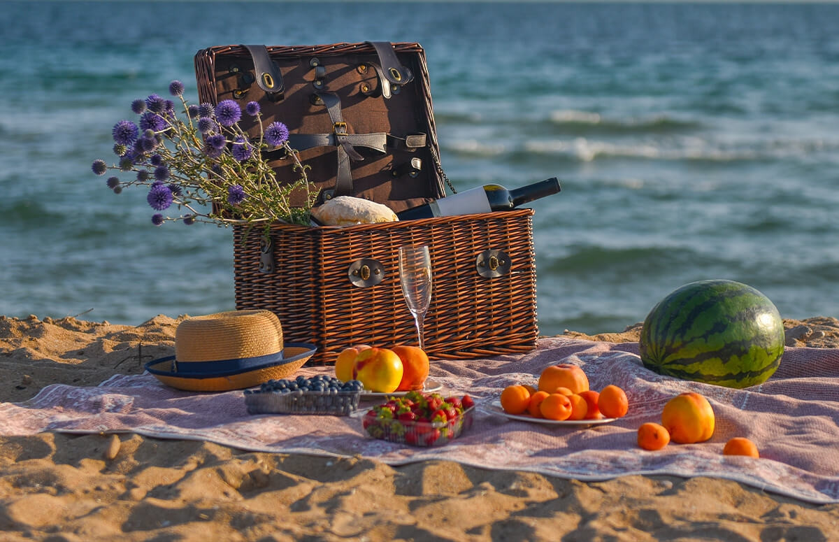 - Piknikowy koszyk z łakociami i butelką wina musującego.